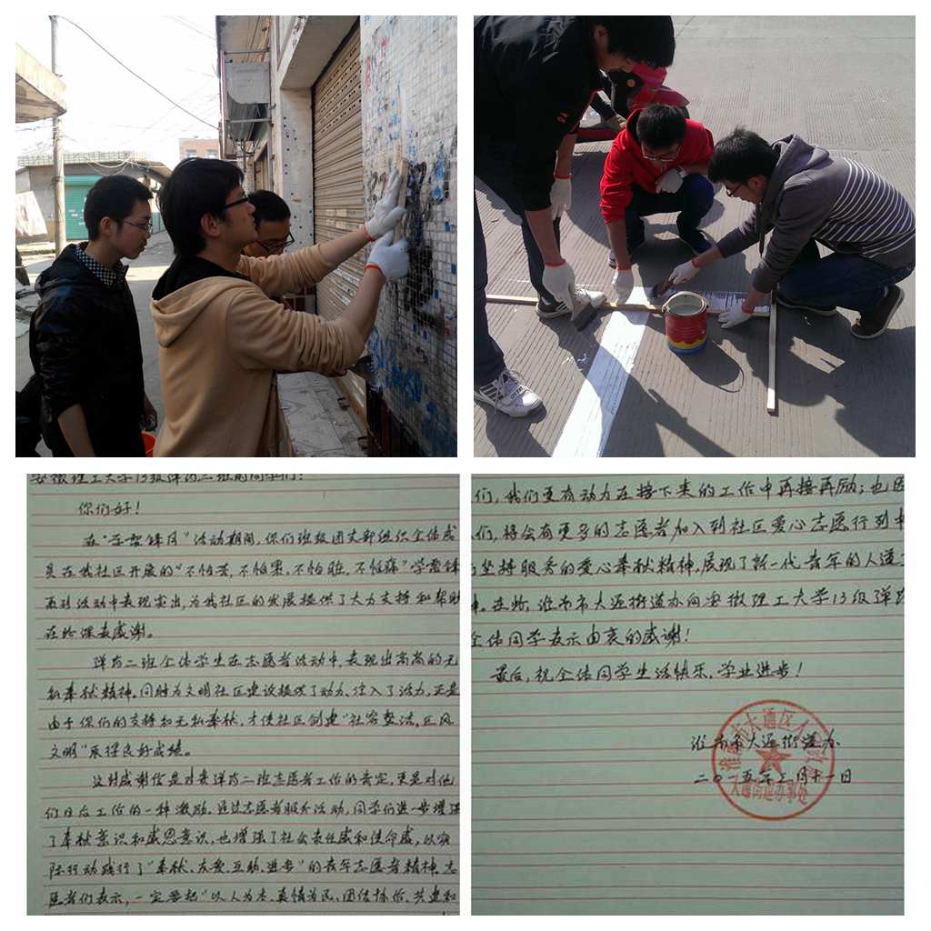 为弘扬雷锋精神,倡导社会文明新风,激引导青年学生践行社会主义核心价值观,3月10日,弹药13-2班团支部来到淮南市大通区大通街道办事处,在周边社区开展了“清洁家园,践行核心价值观”学雷锋系列活动,与社区共建文明家园。