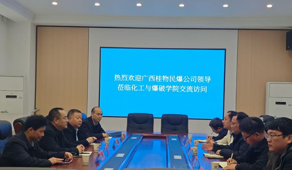2月28日,广西桂物民爆物品有限公司总经理吴香善一行来线上转盘 访问交流。线上转盘 院长汪泉、党委副书记曹秀军、副院长胡劲松以及爆炸科学与工程系部分专业教师在学院东103会议室开展座谈交流,汪泉主持座谈会。