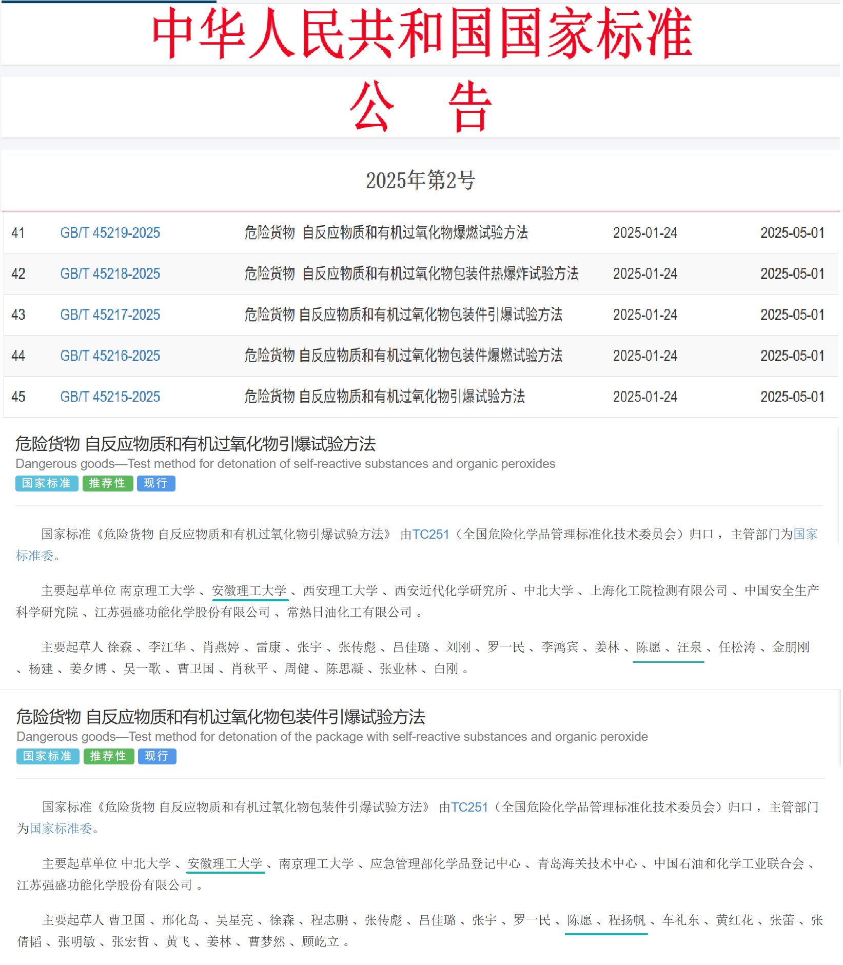 近期,我校作为第二、第三起草单位,由线上转盘 爆炸安全与防控技术团队陈愿高级工程师、汪泉教授和程扬帆教授等参与起草的《危险货物自反应物质和有机过氧化物引爆试验方法》等五项国家标准正式获批发布,并于2025年5月1日起实施。