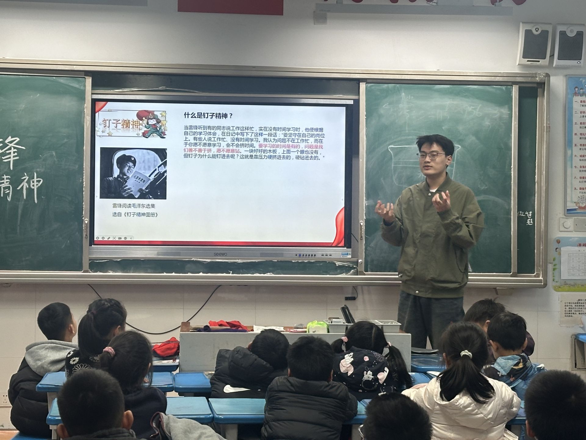 为让雷锋精神“听得懂、学得进、记得牢”,大学生志愿者提前一周精心策划,结合小学生认知特点,设计“故事+思考+问答”的宣讲方案。他们以生动的语言讲述雷锋事迹,巧妙地为小学生们引出“钉子精神”,并让同学们思考发生在自己身边的“活雷锋”,将“助人为乐”“勤俭节约”等品质转化为儿童化语言,让雷锋精神在欢声笑语中落地生根。