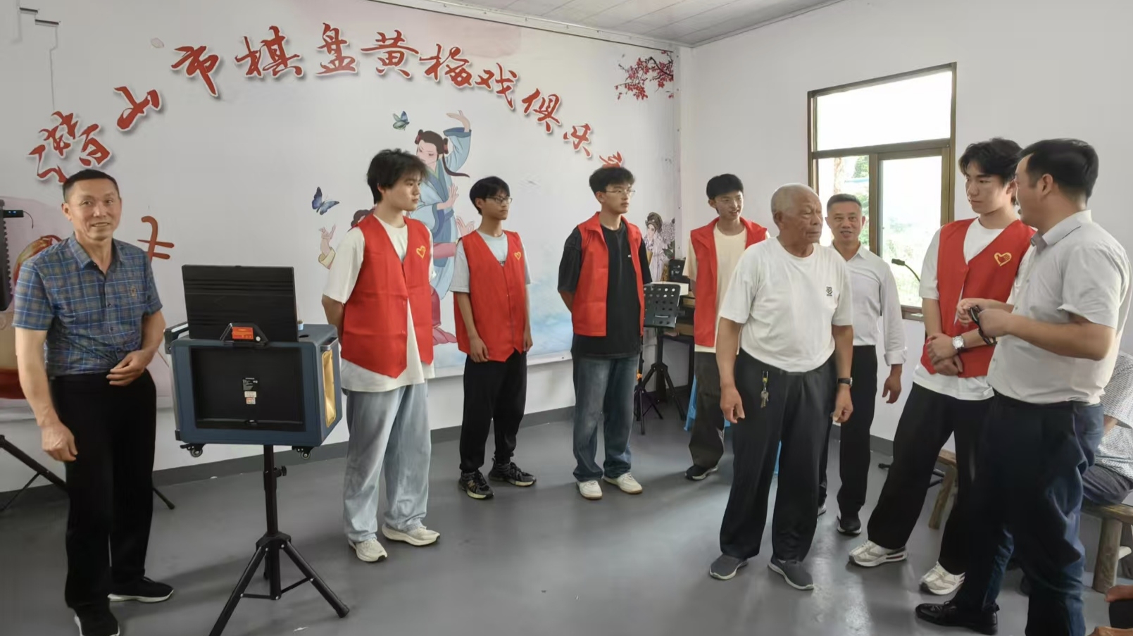 志愿者走进棋盘村,与喜爱黄梅戏的老人畅谈,听他们回忆《天仙配》的演出盛况,讲述与戏曲相伴的岁月,深刻体会到黄梅戏在乡村的文化根基。随后,大家与当地文化负责人交流传承经验并合影,定格两代人接力守护非遗的瞬间。